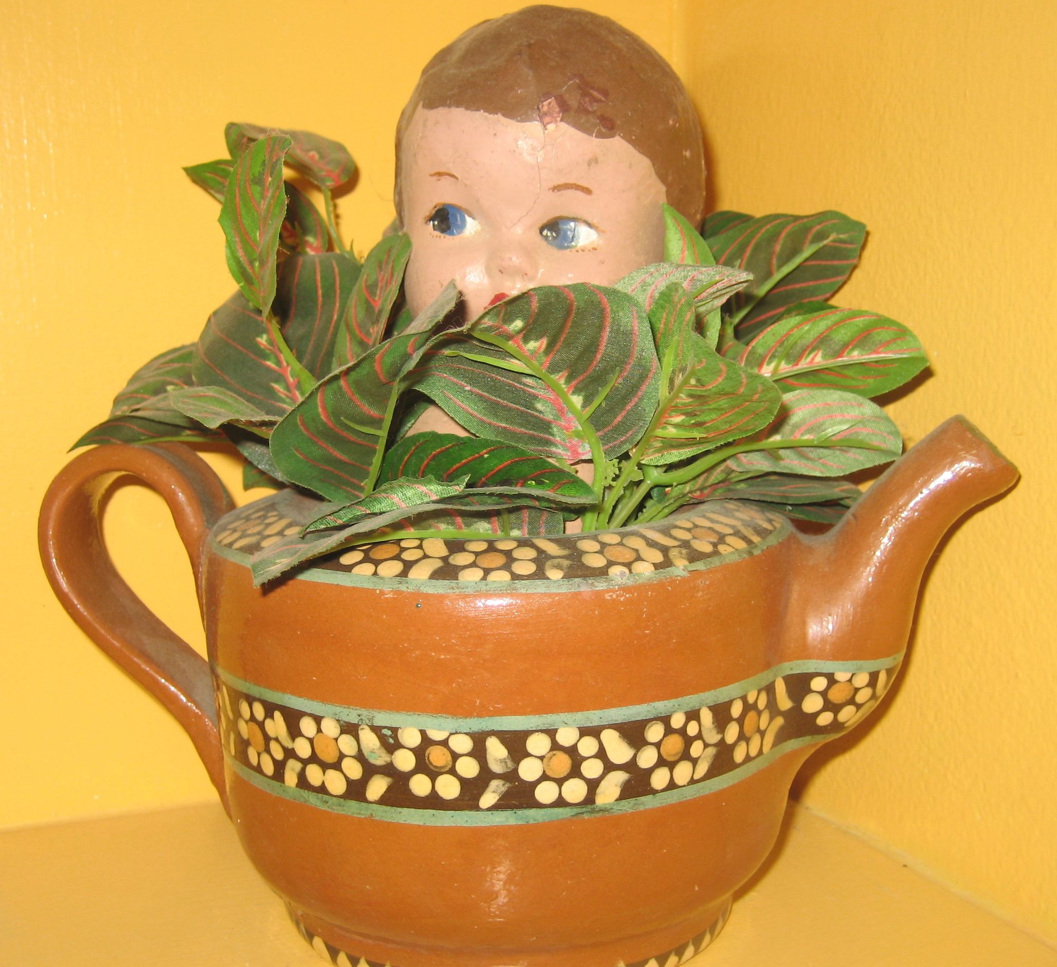 None of it is “museum art”. You won’t be impressed with famous names or even pieces that look like they should be in a museum. Her art is truly expressive, mostly folk art and functional art. I mean, she has an antique doll head on top of a plant in a teapot. Who does this? Well, she does, and it’s fabulous.