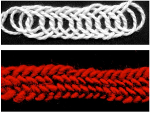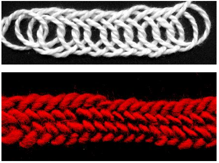 A basic naalebinding stitch, shown in cotton above, and bulky wool below